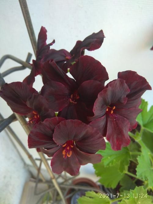 Яркая декоративность куста и пышное цветение при правильном уходе сохранятся с марта по октябрь. Для этого цветок необходимо своевременно обрезать, подкармливать и соблюдать температурный режим.Пеларгония королевская, за исключением нескольких сортов, отличается от других гераней слабо выраженным ароматом. Высота растения не превышает 50 сантиметров. Крупные соцветия отличаются большим разнообразием окрасок. Встречаются белые, розовые, бордовые, фиолетовые и почти черные сорта. На лепестках некоторых присутствует рисунок в виде пятен, черточек и прожилок. Лепестки могут быть махровые с волнистым краем или ровные, раскрывающиеся в плоскость. Цветки королевской герани собраны в зонтичное соцветие, достигающее 15 сантиметров в диаметре и покрывающее все растение. Цветы на королевской пеларгонии появляются в марте-апреле, заканчивается цветение в сентябре.