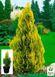 Туя 3-х летняя западная "Golden Smaragd" - это вечнозелёное дерево с узкоколоновидной, плотной кроной, имеет яркую, сочную жёлто-зелёную расцветку. Туя западная Golden Smaragd является новым польским сортом, происходящим от самого популярного сорта туи западной – Smaragd.