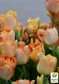 Тюльпан "Charming Lady" - это элегантный представитель группы махровых позднецветущих тюльпанов, который особенно ценится за свою нежную и переливчатую окраску. Его густомахровые бутоны напоминают пион, а лепестки демонстрируют нежную палитру пастельных оттенков: от персиково-розового до кремового и мягко-жёлтого, иногда с абрикосовым подтоном. Высота взрослого растения достигает 35-45 см, диаметр цветка около 10 см. Цветение наступает в мае, делая Charming Lady прекрасным поздним акцентом в весеннем саду.