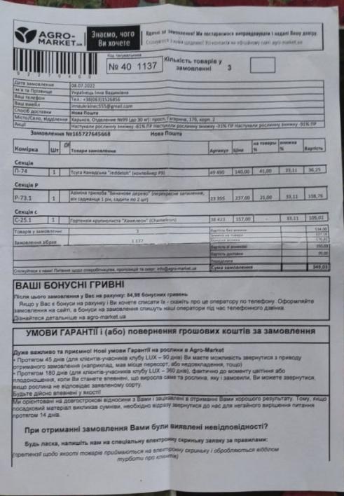 Замовлення роблю не вперше! Команда Агромаркет працює на вищому рівні. Інколи допомагають з вибором . Дякую . Замовила дерева на осінь . Вже готовимо місце для саджанців. Переслали саджанець гортензіі , який вже красується в моєму цвітнику . Саджанець приїхав не пошкоджений. Гарно запакований . Отримувала через укрпочту. Замовленні огірки вже дали всходи. Дякую всім !