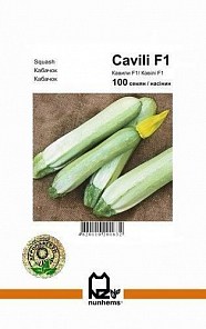 Кабачок «Кавілі» F1 - суперраннеспелий, партенокарпический, високопродуктивний, детермінантний гібрид кабачка призначений для отримання ультраранньої і масової продукції (45-50 днів). Плоди циліндричної форми, дуже прямі, біло-зеленуваті з білою м'якоттю, дуже однорідні, з ніжним смаком. Зазвичай їх збирають при досягненні довжини 16-22 см, проте навіть при переростання вони не втрачають свого ніжного смаку.