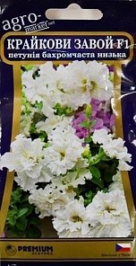 Петунія бахромчата низькоросла "Крайвовий завої F1" - це традиційний сорт з торочкуватими краями рослини висотою 25-35 см і діаметром квітів 6-8см. Сорт призначений для посадки в горщики, ящики і на клумби. Насіння висівають на розсаду з січня по березень. Сходи з'являються через 10-15 днів. Через 2 тижні рослина пікірують в горшкі.Рассаде необхідний своєчасний полив, підживлення і світле місце. Цвіте з кінця квітня і до заморозків.