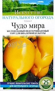 Томат "Чудо світу" - це середньостиглий сорт. Тривалість вегетаційного періоду 110-120 днів. Рослина сильноросла, висотою до 3 м, нагадує ліану. Плід нагадує форму лимона, маса плода 50-60 г, яскраво-жовтого забарвлення. Смакові якості прекрасні. Врожайність до 25 кг з одного куща. Обов'язково потребує підв'язування. Використовують в свіжому вигляді і для консервації.