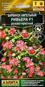 Барвінок ампельний Рів'єра F1 "Рожево-червоний" - це однорічна. Висота рослини 15-20 см. Діаметр квітки 4-5 см. Стійкий до літньої спеки і посухи. Потрійне використання: на клумбах як грунтопокривна рослина, в кімнатних умовах як вазони і для підвісних кошиків. Барвінок - кімнатний багаторічна рослина - все частіше використовують як літник для оформлення квітників відкритого грунту. Нові гібриди Рів'єра F1 відрізняються рясним цвітінням, різноманітністю колірної гами, мають значну стійкість до посухи, літній спеці, а також високою устойчівастью до хвороб. Гібриди Рів'єра F1 чудово виглядають на клумбах як почвопокровнікі, і в горщиках, підвісних корзинах. Їх великою перевагою є невимогливість до вологості грунту, тому що в підвісних композиціях вона швидко висихає. Барвінок воліє теплий, сонячний, захищений від холодних вітрів ділянку. В кімнатах для нього необхідні світлий підвіконня, регулярне обприскування і підгодівлі. Влітку барвінок виносять на балкон. Взимку горщик з рослиною краще тримати в світлому, прохолодному приміщенні з температурою 10-15 ° С. Навесні гілки гібридів слід обрізати приблизно на одну третину.
