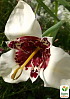Тігрідія "Біла"-це дуже ефектна і ніжна квітка. З однієї цибулини формується 4-6 квітконосів, кожен цветонос прикрашають до п'яти суцвіть. Квітки білі з строкатою, червоною сердцевінкой, нагадують метеликів. Починає цвісти в червні. Квітка пахне приємно, слідкувати, ванільно. Серцевина квітки чашоподібна, з діаметром до шести сантиметрів. Діаметр розкрився бутона до 15 сантиметрів. Бутони розташовані на прямому, пружному, міцному стеблі заввишки від 40 до 50 сантиметрів. Листя прикореневі, подовжені, складчасті. Три тичинки зростаються в високу, гарну люльку.