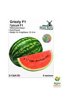 Кавун "Гріззлі F1"- це ранній гібрид кавуна типу «Кримсон Світ». Вегетаційний період – 70-75 днів. Призначення – для вирощування у відкритому ґрунті. Характеристика плодів – маса плодів: 12-14 кг. Гарний, насичений червоний колір м’якоті, відмінний смак. Вміст цукру: 10-11%. Особливості рослини – потужний листовий апарат, нечутливий до сонячних опіків. Дає стабільний врожай при несприятливих умовах. Стійкість – середня стійкість до фузаріозного в’янення.