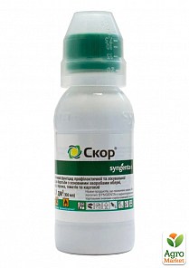 Фунгіцид "Скор" ТМ "Syngenta" 100мл- це фунгіцид лікувальної та профілактичної дії, застосовується на овочевих та плодово-ягідних культурах з метою захисту від грибкових та бактеріальних захворювань. Препарат проникає в рослини, знищує патогенні суперечки грибів у важкодоступних місцях, має тривалий період захисної дії до 30 днів, при цьому не обпалює та не пригнічує рослини.