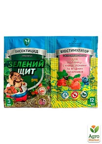 Інсектицид з біостимулятором "Зелений щит" для лохини, полуниці та суниці ТМ "Агромаксі" 12мл + 3мл - це високорезультативний препарат подвійної дії проти переважної кількості комах, що шкодять сільськогосподарським культурам плодовим чагарникам та деревам, а також великої різноманітності хвороб.