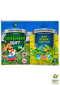 Інсектицид з біостимулятором "Зелений щит" для огірків і кабачків - препаративна форма: концентрат емульсії. Обсяг: 3 мл. Контактно-системний інсектицид для боротьби з широким спектром шкідників огірків, кабачків, цукіні, патисонів і інших культурних рослин. Склад діючих речовин: імідаклоприд 200г / л (клас неонікотиноїди). Препарат ефективний проти приховано живуть шкідників на нижньому боці і в пазухах листків. Ефект впливу спостерігається через 3-5 днів після обробки. Діюча речовина проявляє високу залишкову активність. Термін захисної дії - 14-28 днів. Характерні особливості імідаклоприду: має антистресову дію, по судинній системі проникає переважно в листя і практично не надходить в плоди. Прилипач не дозволяє препарату швидко стікати з листа, зменшує витрату препарату і покращує поглинання препарату рослиною.