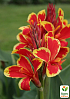 Канна Низькоросла "Lucifer" - це красивоквітуча, багаторічна цибулинна рослина сімейства Каннові. Висота рослини (кущ) становить 45-55 см, ширина до 40 см. Стебла тонкі, міцні та пофарбовані в зелений колір, оточені великими (довжиною 30-35 см), широко ланцетним та зеленим листям. Квітки великі (близько 12 см у діаметрі), пелюстки злегка довгасті і забарвлені насичено жовто-червоним кольором (краї пелюсток жовті).