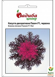 Капуста декоративна "Павич F1" червона ТМ "Садиба центр" - це однорічна культура висотою 25-35 см, діаметр розетки 30-35 см. Листя сильно розсічені темно-червоного кольору по краю і світлого в центрі рослини. На розсаду насіння висівають наприкінці березня на початку квітня, у кожен горщик по 1-2 насінини присипавши шаром ґрунту не більше 1 см. Краще використовувати легкий, багатий на органічні добрива ґрунт. Розсаду накривають склом або плівкою та зволожують у міру підсихання. При температурі 18–20°С сходи з'являються через 3–5 днів. Після цього потрібно знизити температуру до 12-16°С щоб молоді паростки не витяглися. Коли сформується 2-3 справжніх листочка проводять пікіровку у великі ємності. На місце висаджують через 30-35 днів після сходів за схемою 30х45 див.