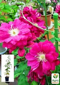 Клематис 3-х річний "Akafuji" - це сорт японської селекції. Квітки діаметром 8-12 см, переважно напівмахрові, пишні. Пелюстки від червоних до червоно-пурпурових, дуже красиво поєднуються з довгими жовтими пильовиками. Забарвлення пелюсток не тьмяніє на сонці. Цвітіння у травні-червні на торішніх пагонах та у серпні на пагонах поточного року. Висота 150 см. Добре підходить для вирощування у контейнерах на балконах та терасах. Зона 5 (до -23 º С).