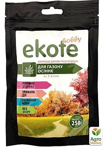 Мінеральне добриво "Ekote" ТМ "ГТУ" осіннє, для газону 250г - це мінеральне підживлення тривалої дії на 3 міс. Її варто купити та використовувати на прибудинкових ділянках, у зонах відпочинку, а також на полях для спортивних ігор. Добриво розроблене спеціально для газонної трави, тому дозволяє виростити густе якісне покриття насиченого зеленого відтінку.