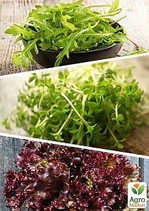 Суміш складається з наступних сортів: одеський кучерявець, лолло роса, крес-салат, рукола, берлінський жовтий, австралійський, малиновий шар, сніжинка, чотири сезони.