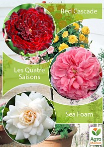 Троянди на штамбі Триколор - це один саджанець, який містить в собі три види і забарвлення різних троянд. Саме в цій позиції з одного саджанця Ви отримаєте такі сорти троянд: Les Quatre Saisons, Red Cascade, Sea Foam.