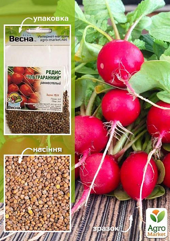 Редис "Ультраранній" - це ультрашвидкостилий (від сходів до збирання 18-20 днів) сорт. Коренеплоди вирівняні, округлі, насичено-червоні, масою 10-15 г, з білою, соковитою, хрумкою м'якоттю, відмінного смаку. Врожайність 13-18 кг-м2. Цінність сорту: стійкість до старіння коренеплодів, рання і дружня віддача врожаю, хороша лежкість. Рекомендується для вживання у свіжому вигляді.