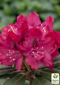 Цвітіння відбувається в кінці травня - початку червня. Квітки дуже великі, діаметром до 8 см, зібрані в щільні округлі суцвіття. Забарвлення - ніжно-рожеве з яскраво-бордовою плямою на верхній пелюстці, яка надає квіткам виразність і глибину. Листя вічнозелене, темно-зелене, блискуче, шкірясте, створює контраст на тлі ніжних квітів.