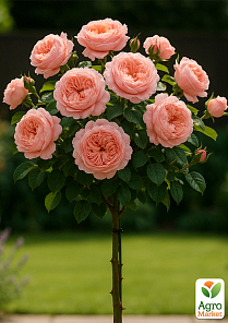 Троянда штамбова "Констанція" - це ефектна штамбова троянда з великими густомахровими розетками відтінків від кремово-рожевого до ніжно-рум'яного. Цвіте хвилями все літо, видає сильний фруктовий аромат (яблуко, груша) - ідеальна для парадних зон та солітерних посадок.