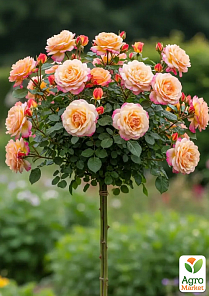 Троянда штамбова "Вувузела" - це ефектна штамбова троянда "флористичного" стилю з дуже повними багатоярусними розетками. Забарвлення - абрикосово-лососьове з рожевим рум'янцем і світлішим кремовим краєм, у прохолоді йде в персиково-рожеві тони. Цвіте хвилями все літо, на штамбі формує округлу, щільну «шапку».