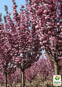 Сакура на штамбі "Роял Бургунді" - це ефектне декоративне дерево з витонченою вузькою кроною, яка в молодому віці колоновидна, а з роками стає більш овальною і акуратною. На штамбі виглядає особливо елегантно, підкреслюючи вертикаль в саду.
