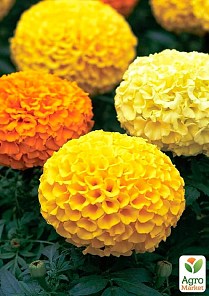 Тагетес "Парад планет" - це суміш трьох відтінків тагетесів (ванільний, жовтий та помаранчевий). Дуже красива великоквіткова низькоросла серія. Найкращі у своїй групі! Рослина компактна, добре гілкується, має міцне стебло і не ламається під час транспортування, зростає 25-30 сантиметрів у висоту та 20-25 сантиметрів у діаметрі. Листочки перисто-розсічені, зеленого кольору. Зацвітає тагетес через 2-2,5 місяці з моменту появи сходів та цвіте до заморозків. Щоб продовжити цвітіння, необхідно видаляти зів'ялі квіточки. Квітки густомахрові, дуже великі, розміром з м'яч для гольфу, досягають діаметром 8-10 сантиметрів, розфарбовані в різноманітні яскраві забарвлення. Мають сильний аромат і не втрачають своєї декоративності більше трьох тижнів. Рослина ідеально підходить для ландшафтного озеленення та посадки у вазони та клумби, буде ефектно виглядати як у балконних ящиках, так і як культура для горщика. Добре і довго стоїть у зрізанні. Тагетес (Чорнобривці) – невибагливі, посухостійкі та світлолюбні рослини, але виносять невелике затінення. Завдяки стійкості до несприятливих погодних умов (вітер, дощ), кущ чудово тримає форму і заслуговує на центральне місце в саду.