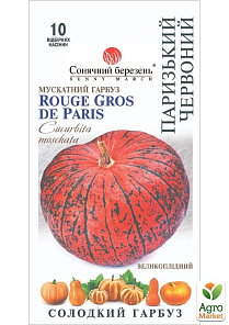 Гарбуз "Паризький червоний" - це високоврожайний середньопізній (110-115 днів) сорт з високим вмістом каротину. Плоди червоно-оранжевого кольору, округло-плескаті з сегментованою ні часточкою поверхнею. М'якуш насиченого оранжевого кольору, щільний з прекрасним солодким кусом. Середня маса плодя 15-20 кг. Стійкий до захворювань. Призначений для приготування соків та пюре у промисловій переробці. На свіжому ринку використовується для приготування різних типів каші, висока сила росту, потужні кущі, великі плоди, гарний червоний колір і солодкий смак – ось головні переваги того сорту. При жому нею врожайність перевищує 100 тонн/га.